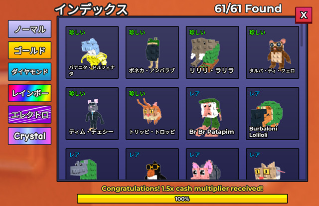 本ゲームで集められるブレインロットは、2026年3月16日のアップデートで新キャラが追加され、全61種類になりました。